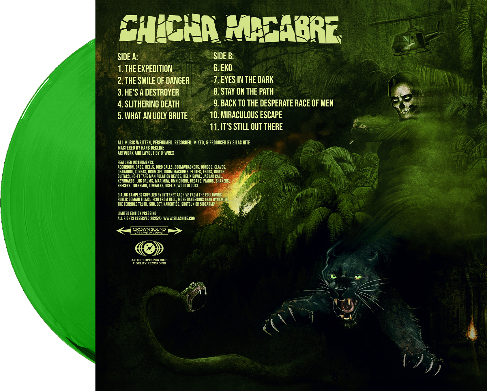 This album draws inspiration from 1970s Peruvian chicha music and blends it seamlessly with dialogue samples from newly uncovered archival documentary footage. Together, they hint at a twisted narrative involving a mysterious creature, ancient temples, doomed explorers, and vicious jungle predators—evoking the feel of an epic action-horror film set deep in the unforgiving jungles of South America.