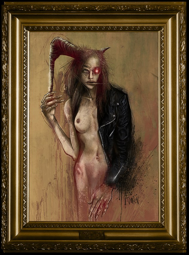 An acquaintance of mine who works for the DOJ in some small compacity relayed this photograph to me from an ongoing investigation into a money laundering operation, Seen here is my Belinda the Gorgon painting hanging on the wall of this corrupt businessman’s office. Apparently, this dude, whoever he is, was allegedly purchasing and reselling artwork to top-shelf art galleries and collectors around the globe as a way of laundering millions of shady dollars into an off-shore bank account.