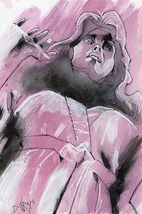 4″x6″ illustration of a woman moments before she was killed by a giant power drill