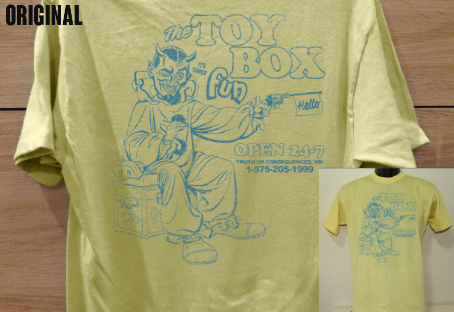 Available for a limited time. – This sole surviving unique find was originally discovered and acquired at a thrift store outside of Mountainair NM in 1998 by an eccentric Swiss collector known for curating an unparalleled archive of rare, one-off vintage graphic tees. The collection, now largely hidden from public view, is sporadically revealed through an obscure, invite-only dark web image gallery. According to the collector, it carries an ominous backstory though he declined to elaborate further, citing reasons he simply described as “better left undiscovered.”